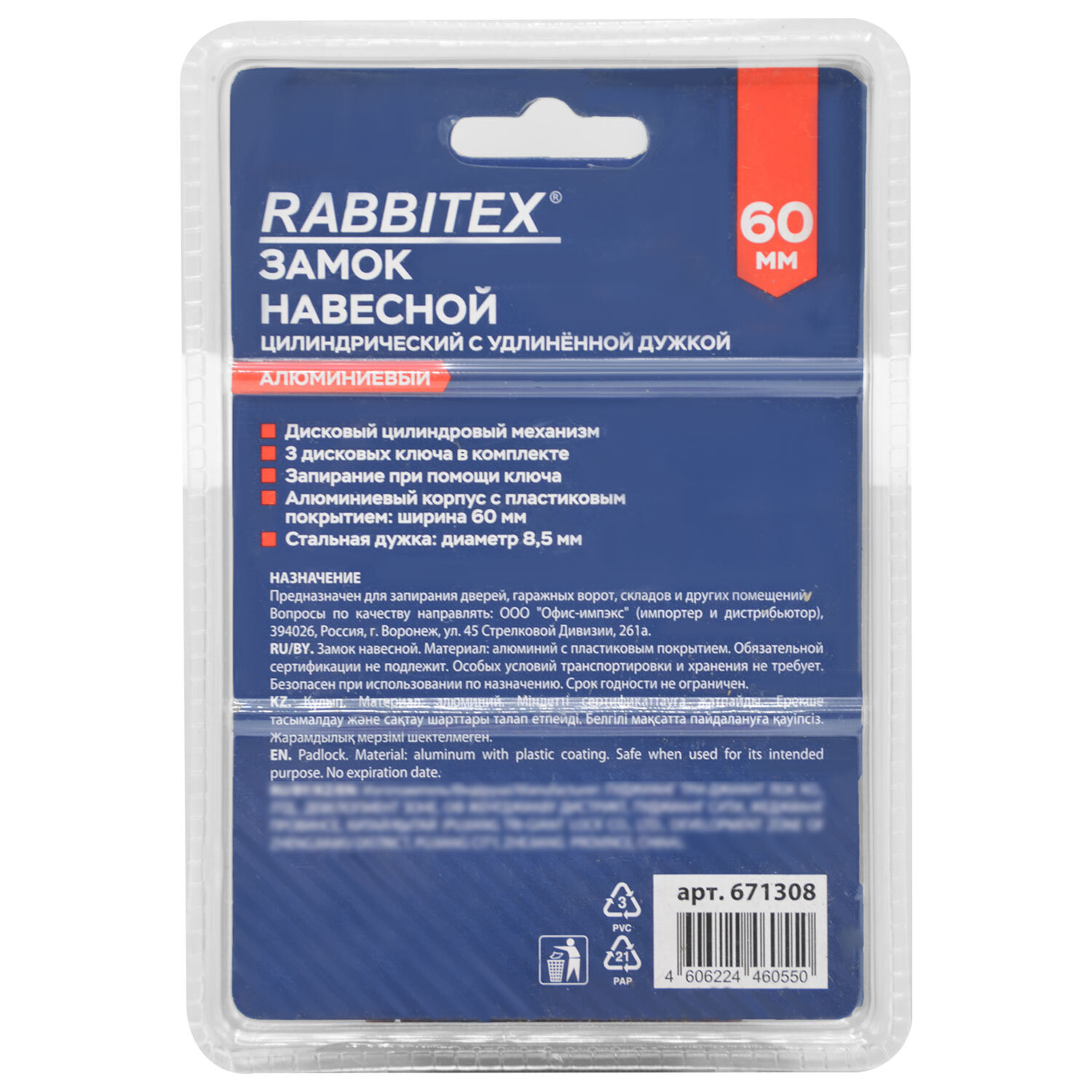 Замок навесной алюминиевый 60 мм, цилиндрический с удлиненной дужкой «Стандарт», RABBITEX (РАББИТЕКС), 671308