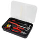 Все инструменты располагаются в компактном пластиковом боксе с полупрозрачной крышкой. Для каждого предмета в наборе предусмотрено специальное углубление для удобства хранения.