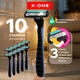 Одноразовая бритва X-ONE с тремя тонкими и острыми лезвиями, смазывающей полоской, уменьшающей раздражение, и плавающей головкой. В упаковке 10 штук.