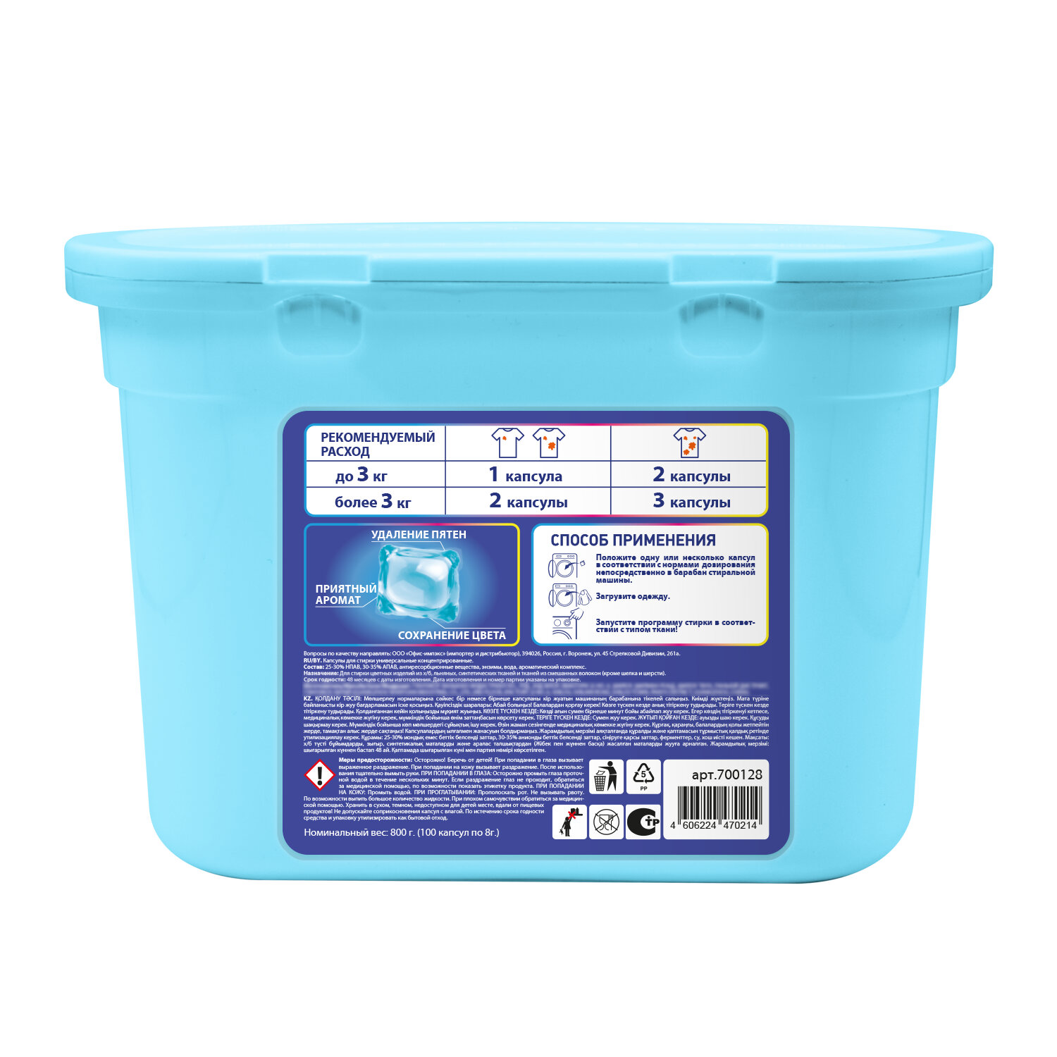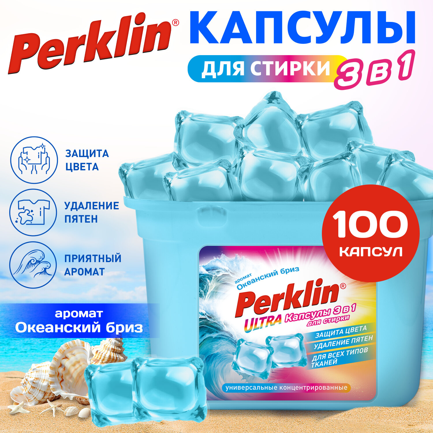 Капсулы для стирки белья PERKLIN (ПЕРКЛИН) «ОКЕАНСКИЙ БРИЗ» концентрат 3 в 1 с кондиционером 100 шт., 700128