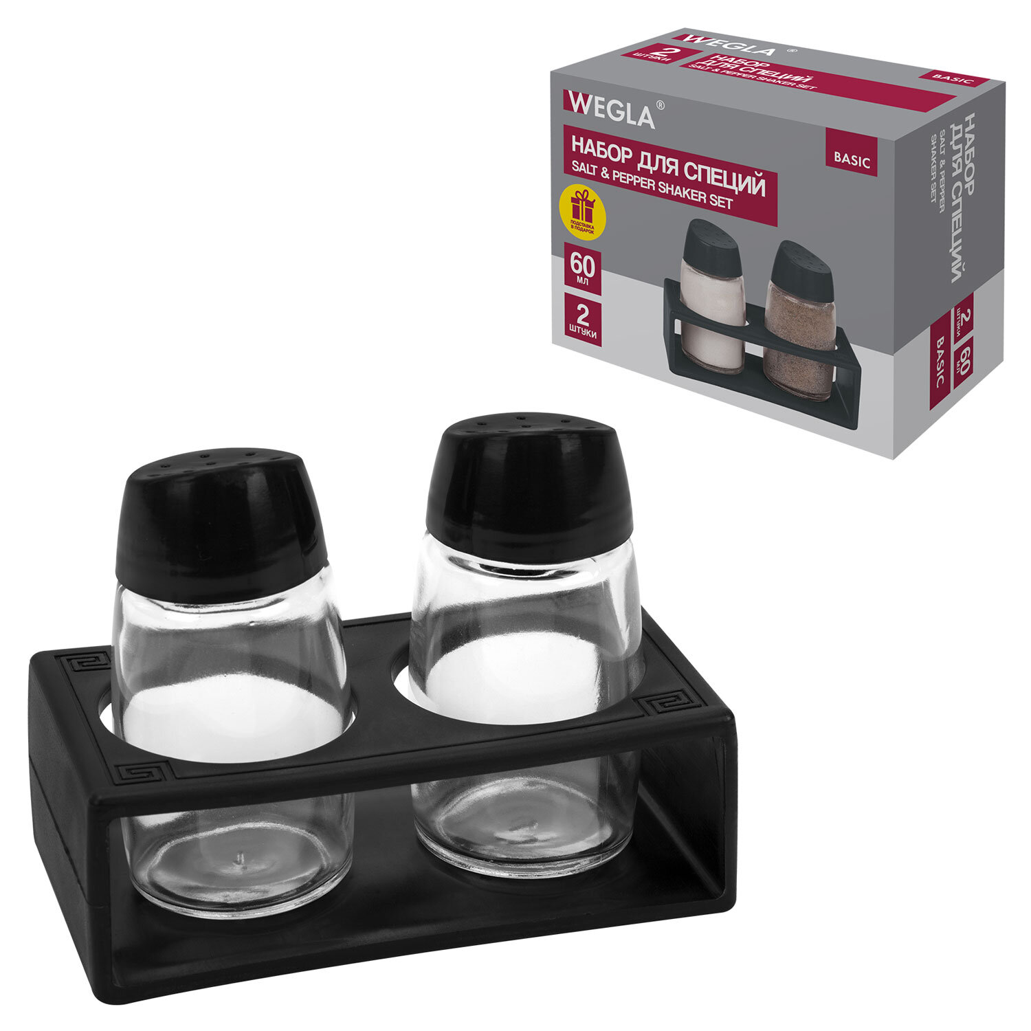 Набор для специй WEGLA с подставкой – это универсальный аксессуар для безупречной сервировки! Cостоит из двух солонок-перечниц объемом 60 мл из прозрачного стекла. Крышки из пищевого пластика с перфорацией обеспечивают дозированную подачу соли и перца.