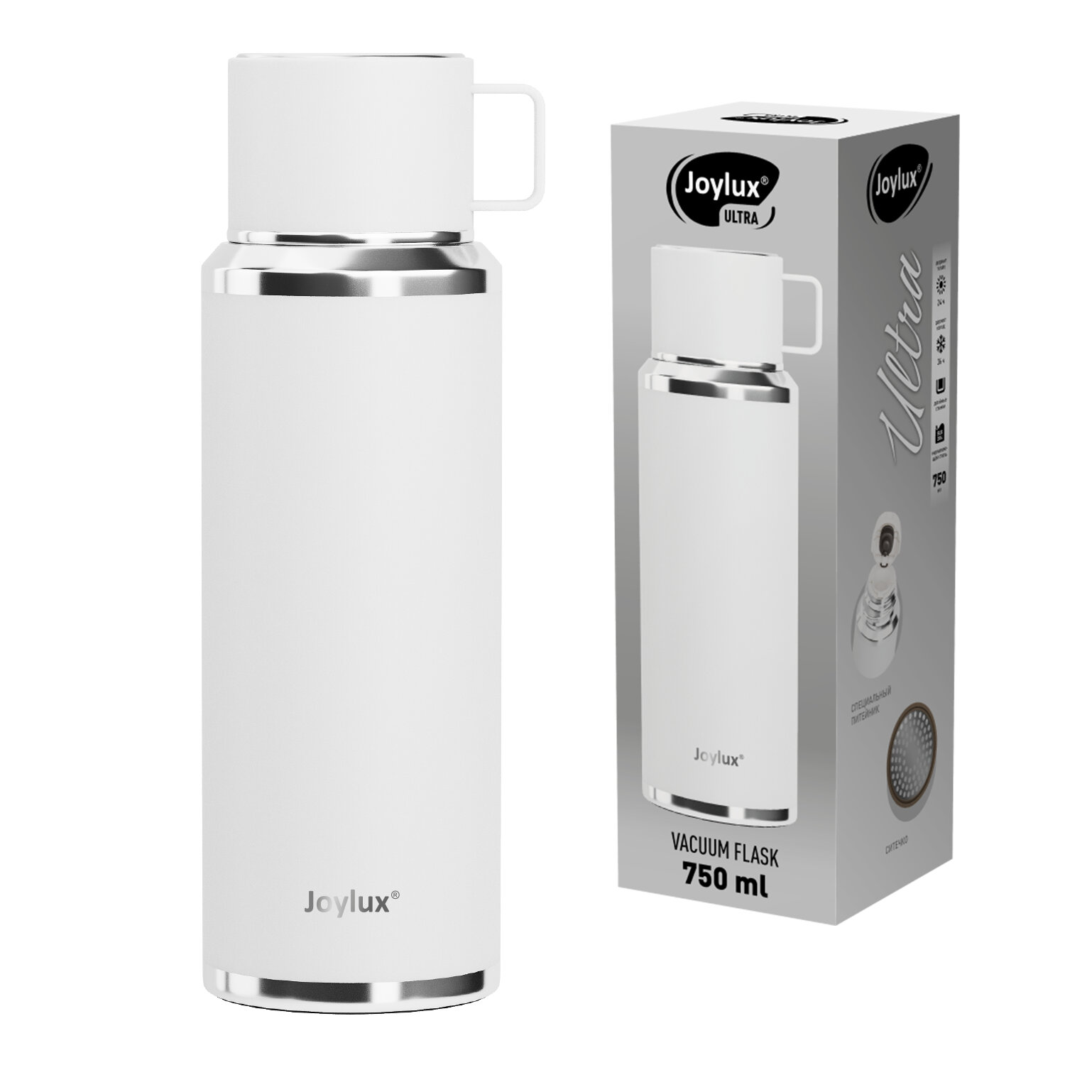 Термос JOYLUX ULTRA – продуманное сочетание функциональности и эстетики: его крышка из нержавеющей стали служит удобной кружкой с ручкой и эффектной зеркальной полировкой, а винтовая пробка с питейником позволяет наливать напиток, не открывая крышку полностью. Внутри термоса установлено ситечко из нержавеющей стали – с ним вы можете заваривать чай или фруктовые настои прямо в термосе, не беспокоясь о попадании листьев чая или ягод в напиток. Корпус имеет порошковое покрытие белого цвета, которое не только обеспечивает термосу стильный дизайн, но и препятствует появлению мелких царапин при долгосрочном использовании.