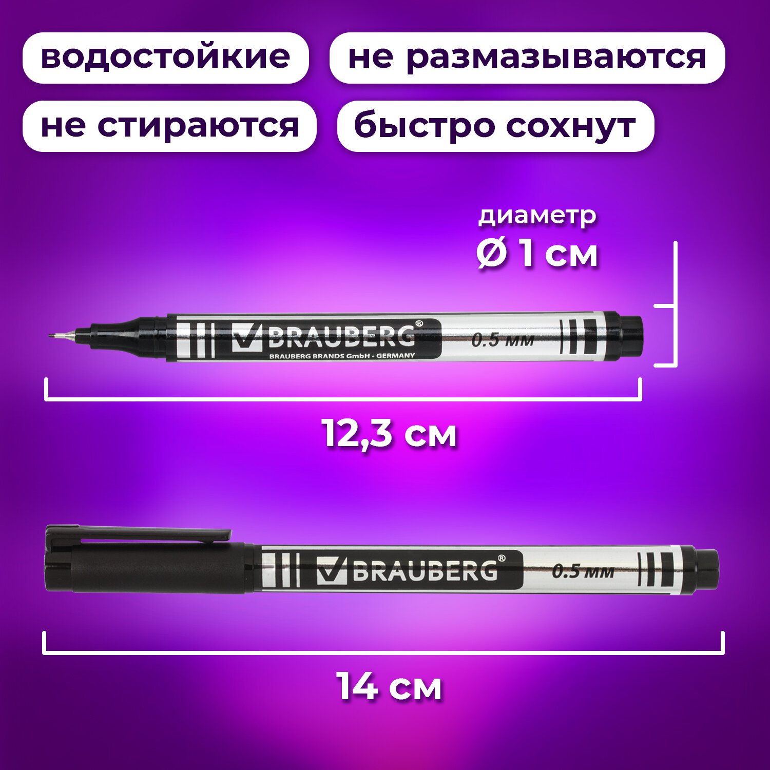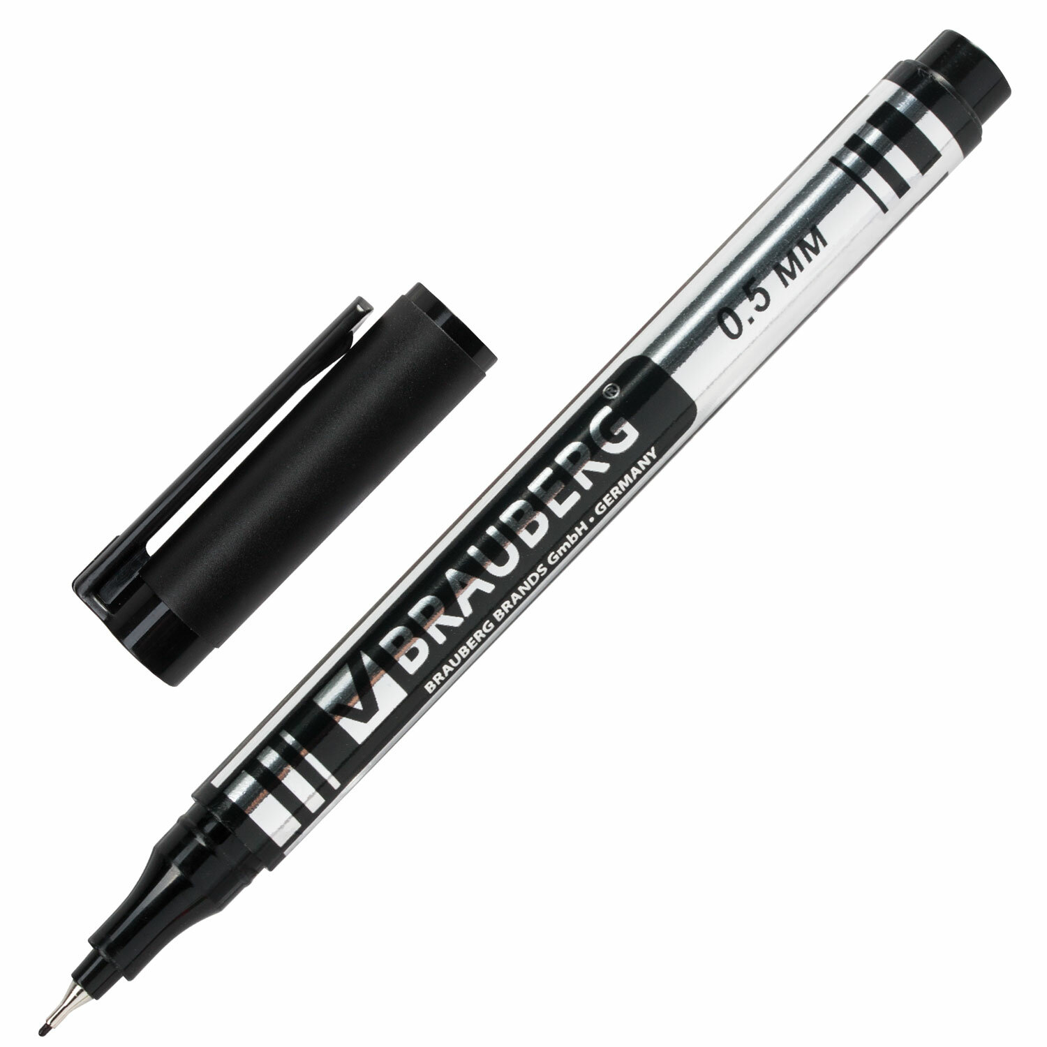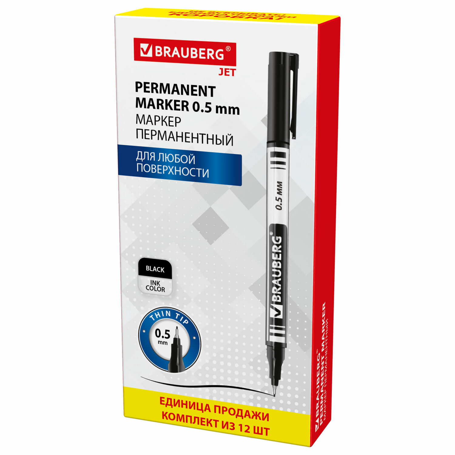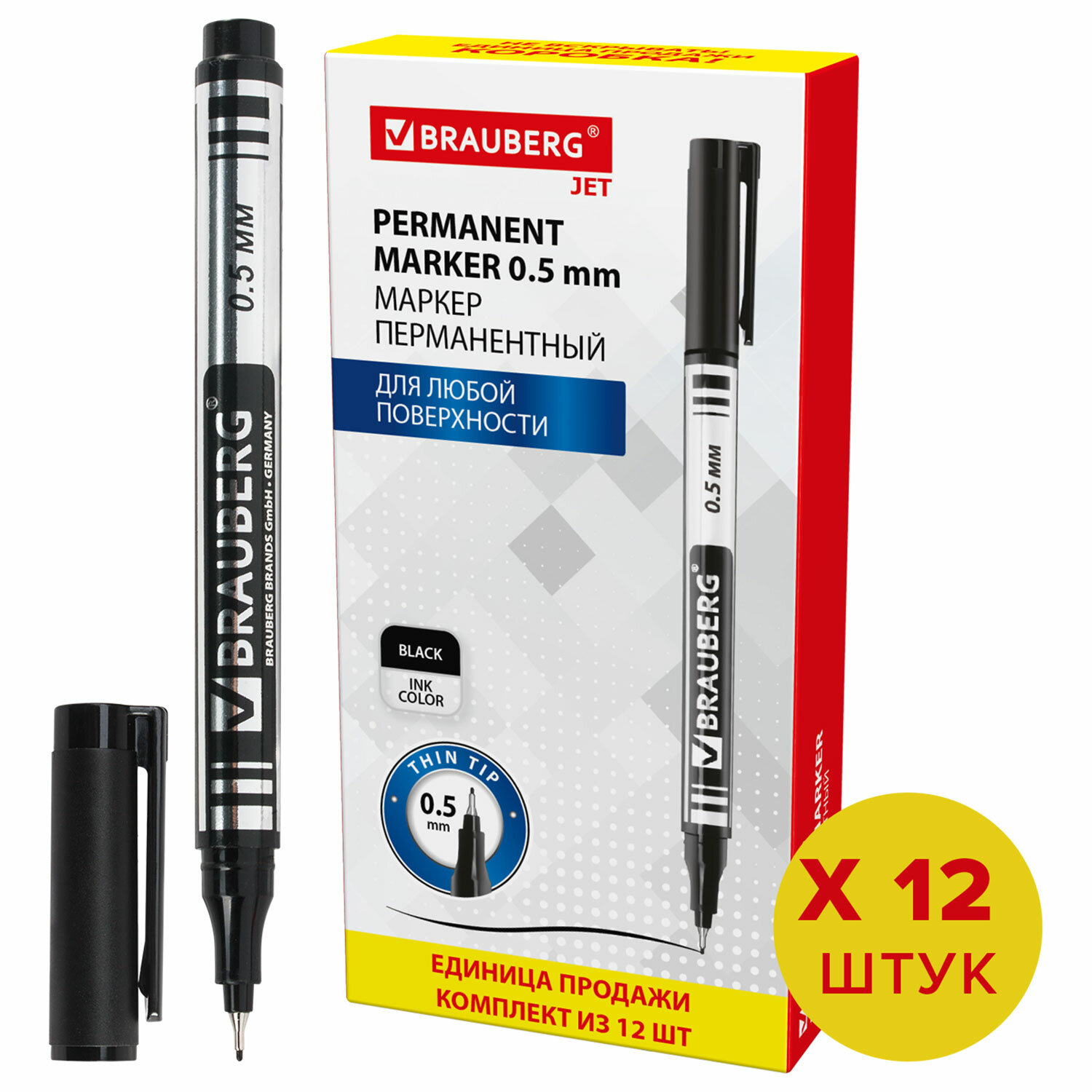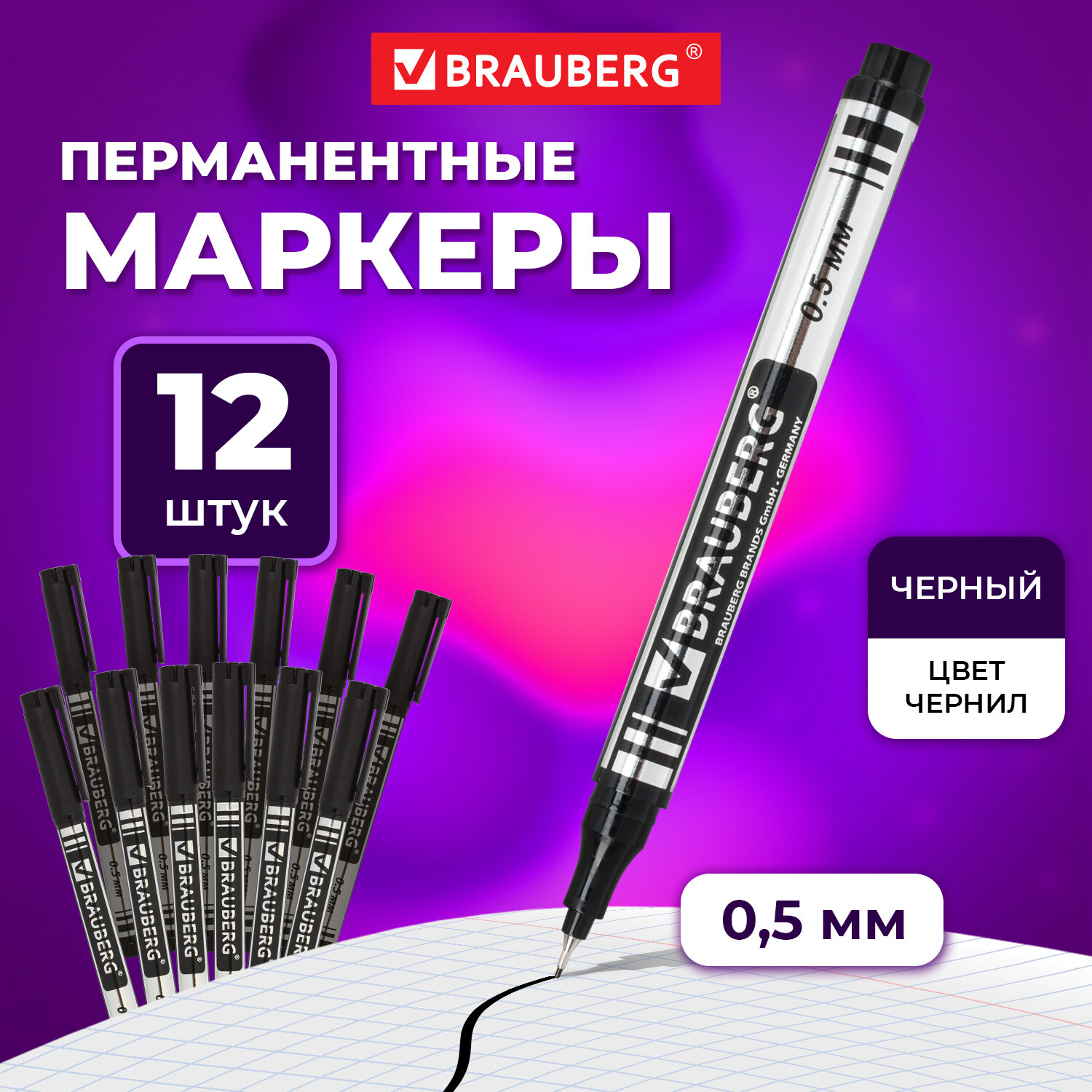 Маркер перманентный (нестираемый) черный тонкий 0,5 мм КОМПЛЕКТ 12 штук, BRAUBERG, 880245