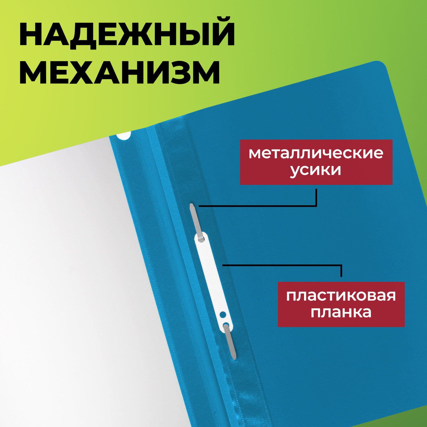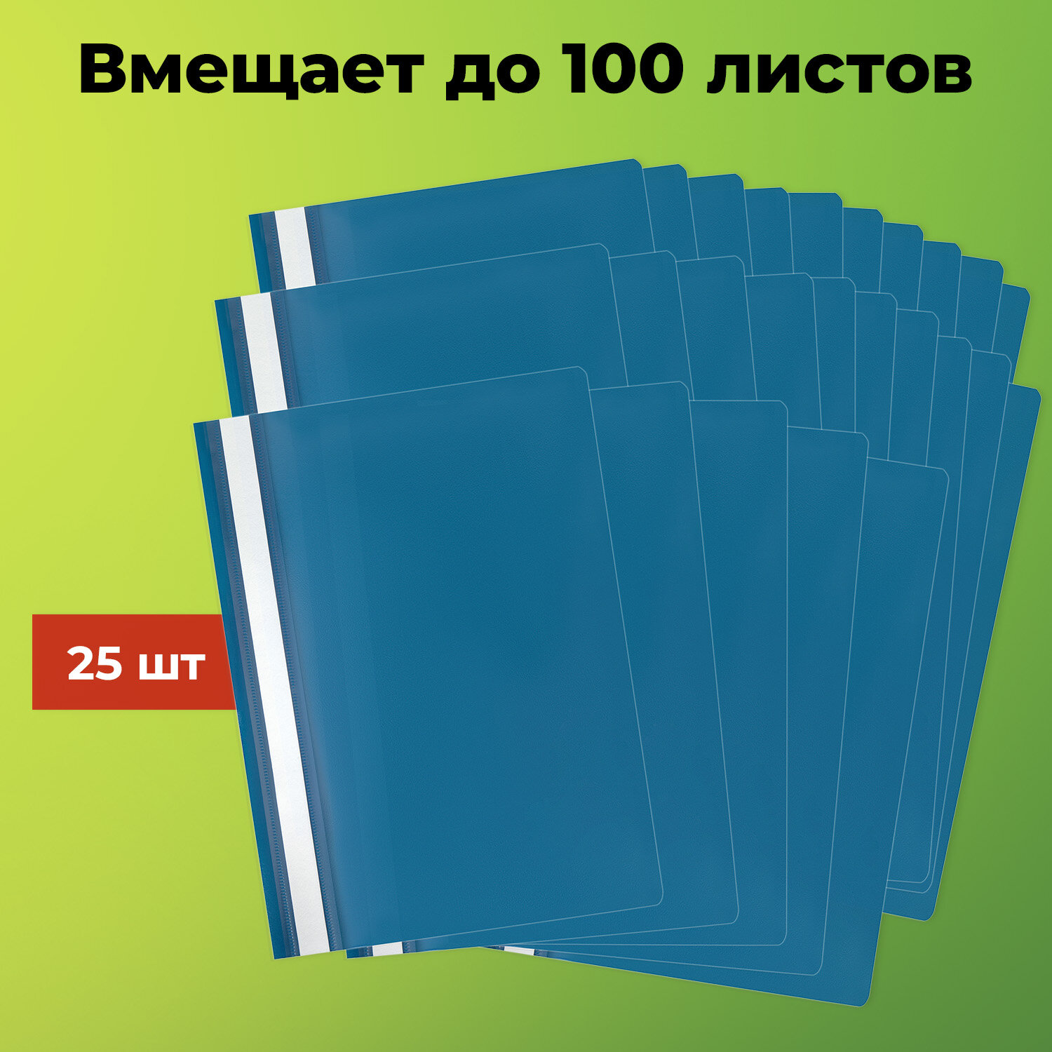 Скоросшиватели фиксируют до 100 листов формата А4. Толщина пластика верхнего листа составляет 100 мкм, а нижнего - 120 мкм. Предельно простой механизм подшивки: металлические усики и пластиковая планка для надежной фиксации документов. Скоросшиватели изготовлены из качественного полипропилена. Прозрачный верхний лист позволяет определить содержимое, не открывая скоросшиватель, который к тому же снабжен сменным пластиковым корешком, что дает возможность структурировать информацию. Благодаря фактуре "песок" и насыщенному синему цвету обложки папки никогда не затеряются на полке.